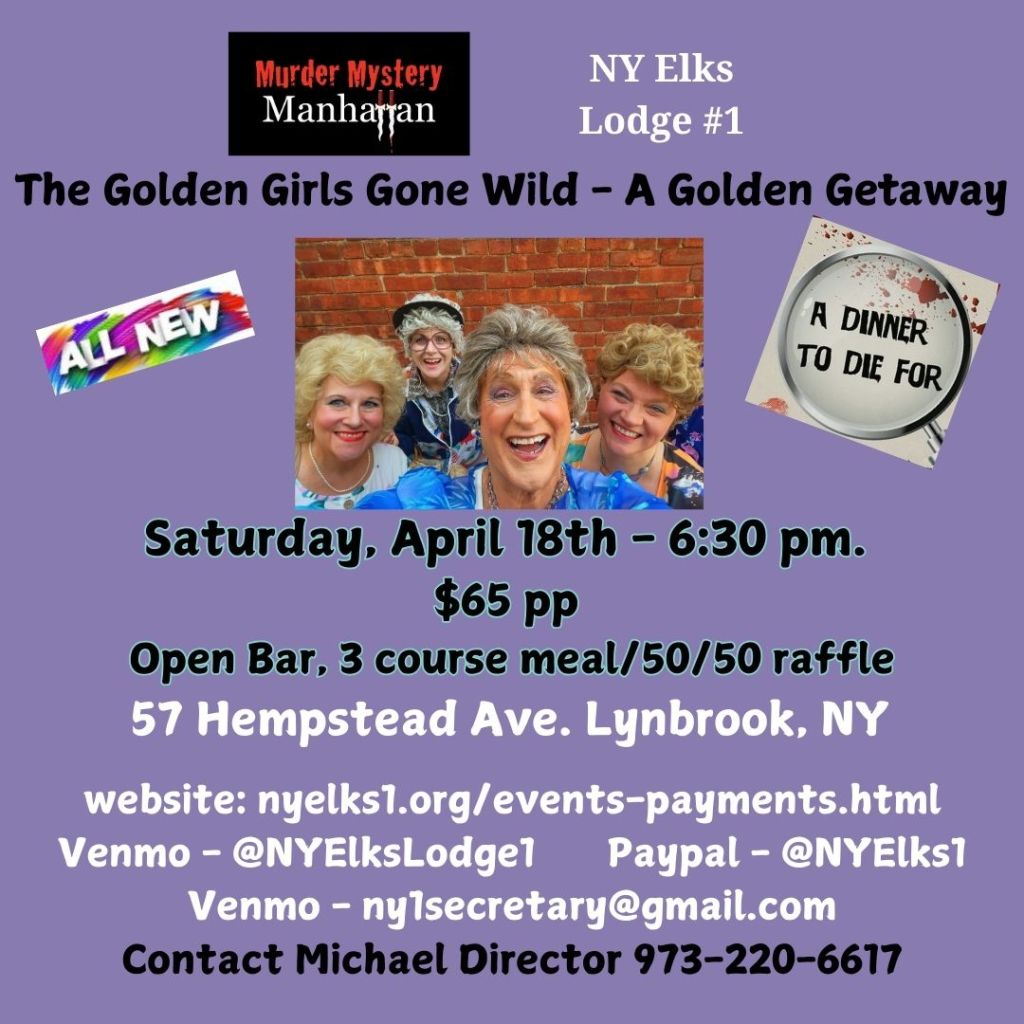 Saturday, April 18th – ALL NEW The Golden Girls Gone Wild – GOLDEN GETAWAY Murder Mystery Dinner for Elks Lodge 1 in Lynbrook, NY. Show and reservation info to follow.
