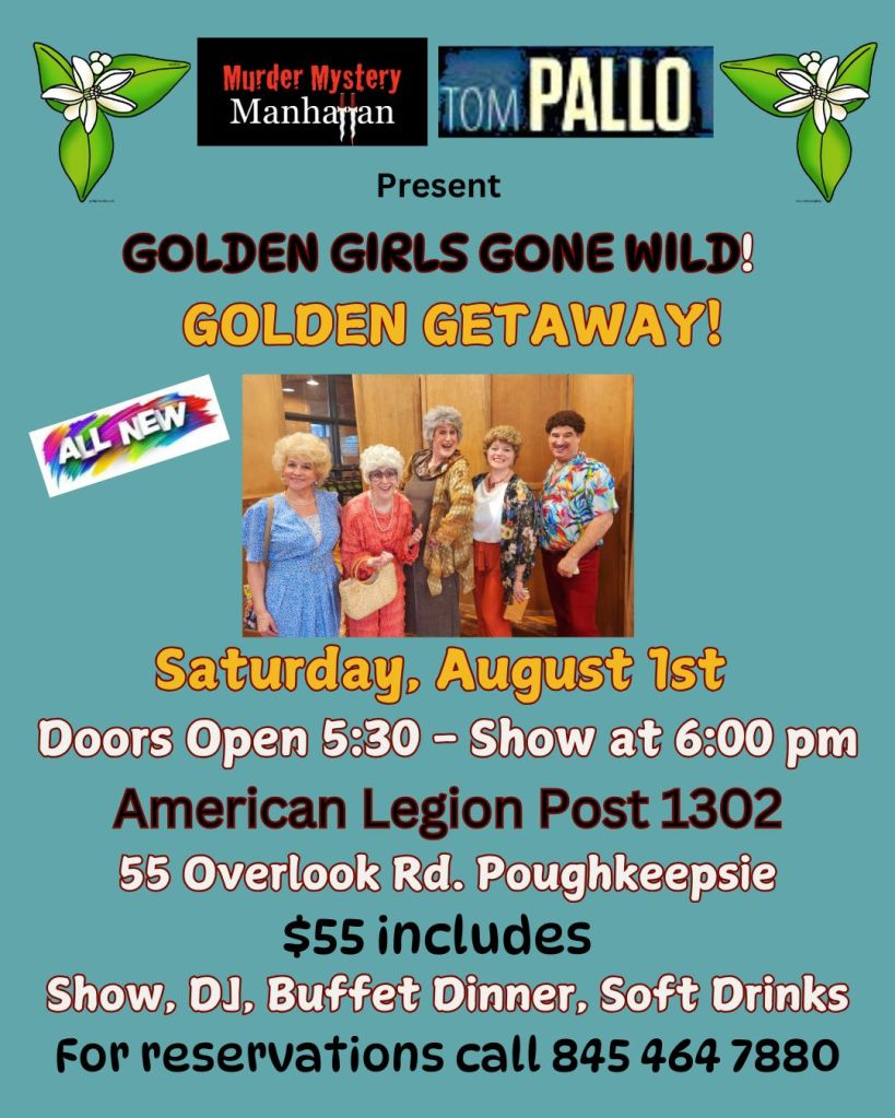 Saturday, April 18th – ALL NEW The Golden Girls Gone Wild – GOLDEN GETAWAY Murder Mystery Dinner for Elks Lodge 1 in Lynbrook, NY. Show and reservation info to follow.