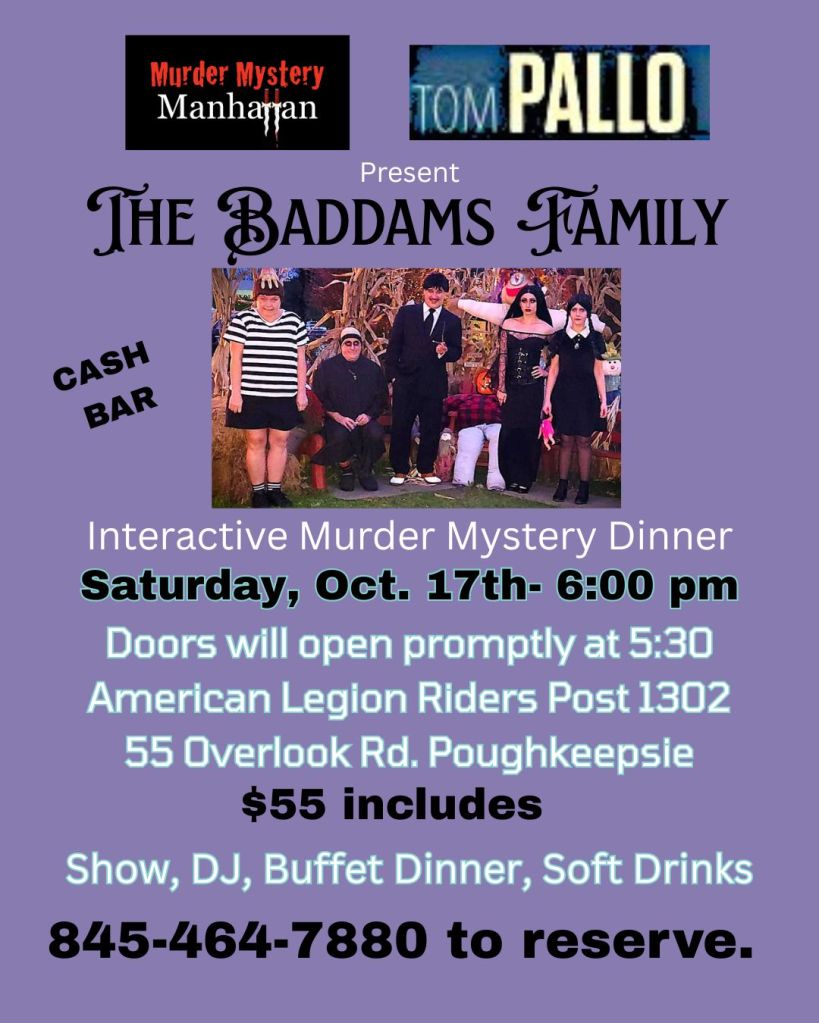 Saturday, October 17th at 6:00 p.m. – THE BADDAMS FAMILY -Interactive Murder Mystery Dinner at The American Legion Post 1302 in Poughkeepsie, NY.