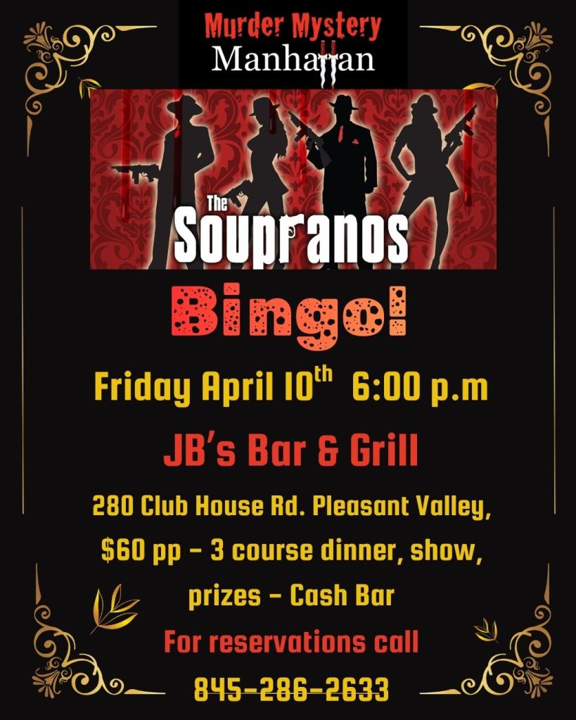 Friday, April 24th – 7 p.m. – THE SOUPRANOS – GRAVY OR SAUCE? – a fundraiser for the Putnam Humane Society – at Anthony’s Lake Club. Order tickets @ http://www.puthumane.org or 845-278-7068